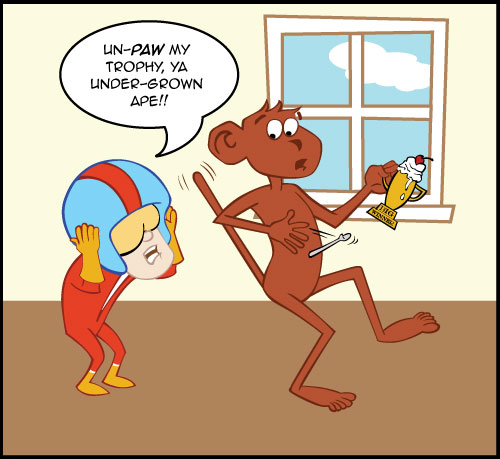For some time I’ve been playing with ideas for a comic strip involving the characters shown above. Zip Crashwell is a former race car driver who’s had a few too many concussions. As a result, he’s plagued by an over-active hallucination in the form of a monkey who’s only mission seems to be to drive Zip over the edge.